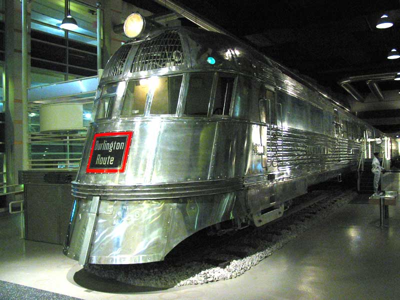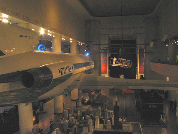 The aviation exhibit has changed quite a bit. Here, in the foreground, suspended from the ceiling, is a Boeing 727. The port side of the fuselage abuts the 2nd floor balcony, allowing one to walk through an opening at the rear of the plane and tour the interior. In the shadowed midground is a biplane of the type used long ago for carrying mail. In the background hangs a replica of the first airplane flown by Orville Wright. On the floor below is a small part of the model train exhibit which includes a replica of downtown Chicago high-rise buildings.