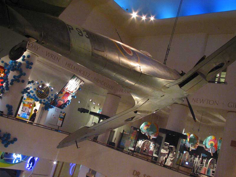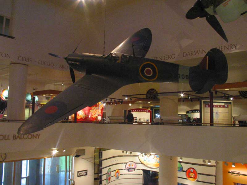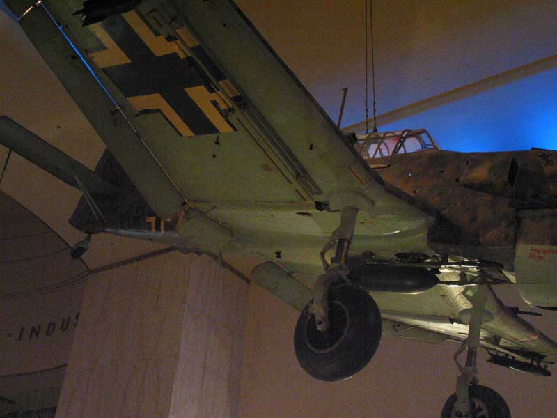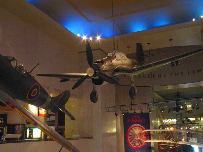 Farther down this long hall still hangs the German Stuka dive bomber, and the British Spitfire that swept Stukas from the skies during World War II.